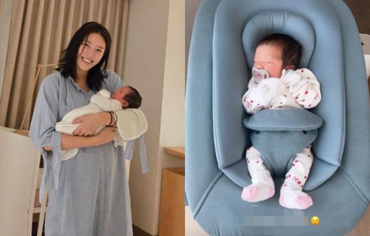 공개된 사진에는 생후 21일차 손담비의 딸 해이의 모습이 담겼다. 해이는 고가의 하이체어에 누운 채 곤히 잠들어있는 모습.