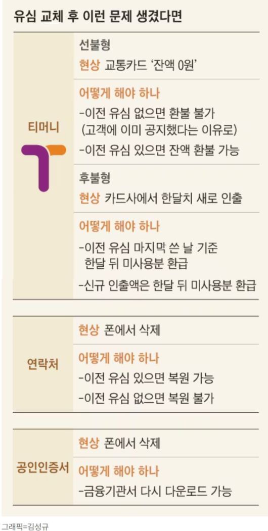 티머니 후불형 사용자들은 사전에 환불 신청을 할 필요는 없다. 하지만 유심 교체 후 티머니를 작동시키면 카드사에서 이용자가 월 교통비로 설정해 놓은 금액을 새로 인출해 가는 만큼 이용자들 사이에선 ‘중복 결제가 된 게 아니냐’는 우려가 나오고 있다. 티머니 측은 “유심을 교체하면 새 폰으로 인식하기 때문에 이용자가 정해 놓은 교통비 금액이 나간 것”이라며 “기존 유심(교체전 유심)으로 티머니를 마지막까지 쓴 날짜를 기준으로 한달 뒤 미사용분이 환급되고, 유심 교체 후 새로 인출된 금액은 한 달 뒤에 사용분을 제하고 환급된다. 이후엔 예전처럼 정상적으로 빠져나간다”고 했다.
