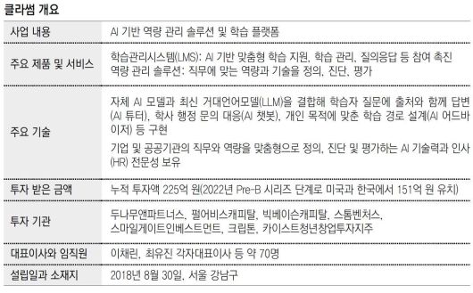 클라썸은 “유·무료 버전을 통틀어 세계 32개국 1만3000여 곳이 우리의 AI 기반 학습 플랫폼을 사용 중”이라고 했다. 삼성과 LG, 현대차 등 주요 그룹별 기업들과 서울대와 KAIST, 연세대, 국민대, 숭실대, 인하대, 한림대, 울산대, 동의대, 대구한의대, 계명대, 배화여대, 대구대, 구미대 등에서 전체 혹은 일부가 활용하고 있다.