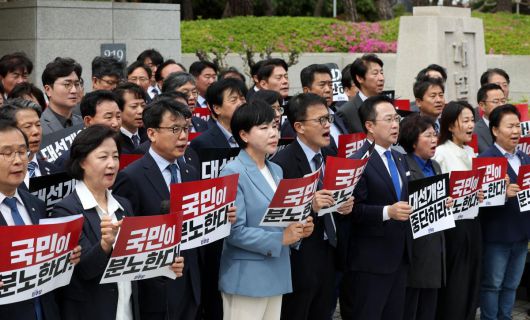민주당 의원들 “사법 쿠데타” 대법원 항의 방문 더불어민주당 의원 50여 명이 2일 서울 서초구 대법원 앞에서 열린 기자회견에서 민주당 이재명 대선 후보의 공직선거법 위반 사건 상고심 결과를 규탄하는 손팻말을 들고 있다. 민주당 의원들은 이날 “대법원은 결국 내란세력의 ‘이재명 죽이기’에 동조한 것”이라며 “파기환송 판결은 불과 대통령선거를 33일 앞두고 벌어진 명백한 대선 개입이자 사법 쿠데타”라고 밝혔다. 뉴시스 |