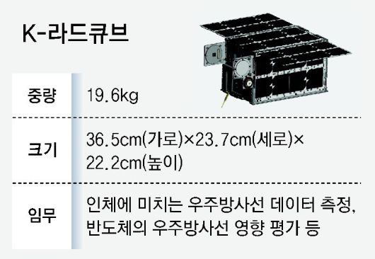 K-라드큐브는 가로 36.5cm, 세로 23.7cm, 높이 22.2cm, 무게 19.6kg의 작은 큐브 위성으로 한국천문연구원 주관 아래 국내 우주 스타트업 나라스페이스가 개발하고 있다. 개발이 완료되면 올해 7월 비행 인증을 완료한 뒤 NASA로 인도할 예정이다. 이후 위성 운용 및 데이터 수집, 분석은 천문연이 맡아 진행한다.