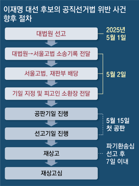 법조계에서는 파기환송심 선고가 6월 3일 대선 전에 나올 가능성도 있다는 분석이 나온다. 사실관계를 따지는 재판이 아니라서 추가 증인 신문 등의 절차가 필요 없기 때문이다. 법조계 관계자는 “파기환송심은 유죄 취지의 대법원 판단과 상반되는 판결을 할 수 없는 데다, 추가 증거 조사도 불필요해 절차상 한 달 내에 선고가 가능하다”고 말했다.