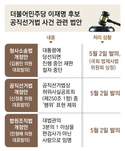 대법원이 더불어민주당 이재명 대선 후보의 공직선거법 위반 사건 상고심에서 유죄 취지로 파기환송을 결정한 지 하루 만인 2일 민주당은 이 후보 재판 관련 입법을 쏟아냈다. 대법원 선고로 이 후보의 대선 후보 자격 논란 등 사법리스크가 재점화되자 입법 폭주라는 비판을 무릅쓰고 모든 수단을 총동원하겠다는 뜻을 분명히 한 것으로 풀이된다. 국민의힘에서 “이재명 방탄 악법이자 입법 쿠데타”라고 비판하고 나선 가운데 민주당 내부에서도 “입법 횡포로 비치면 중도층 여론에는 악영향을 줄 수 있다”는 우려가 나온다.