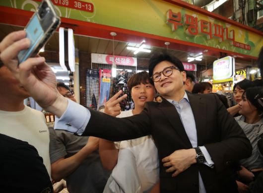 부산지역을 방문한 한 후보가 부평깡통시장에서 시민들과 사진을 촬영하는 모습. [뉴스1] |
