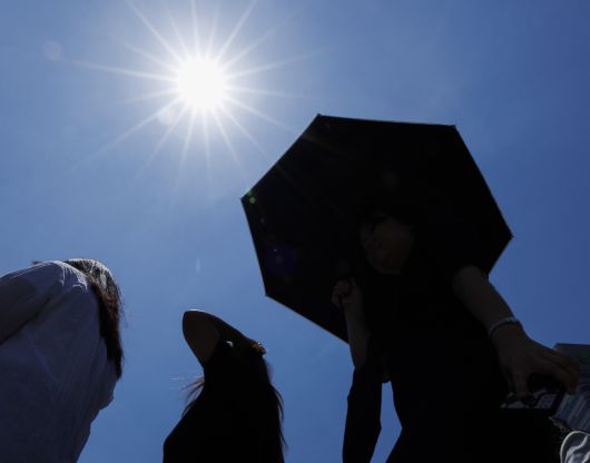 서울 광화문 건널목에서 시민들이 작열하는 태양 아래 이동하고 있다. 연합뉴스