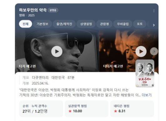3일 서울경제신문 취재에 따르면 최근 일부 윤 전 대통령 지지자 메신저방에서는 지난달 16일 개봉한 다큐 영화 ‘하보우만의 약속’과 관련한 단체 관람 촉구 메시지가 잇달아 올라오고 있다. 해당 영화는 이승만 전 대통령 탄생 150주년을 맞아 제작됐으며 박정희 전 대통령 등에 대한 긍정적 평가를 담아낸 것으로 알려졌다.