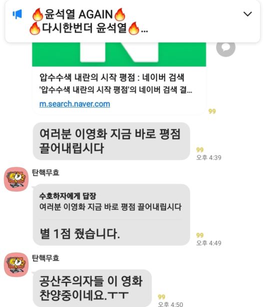 한 텔레그램 대화방에서는 ‘압수수색: 내란의 시작’을 향해 “대통령님을 모욕하는 영화”라면서 “기대지수 ‘싫어요’를 다같이 눌러야한다”고 영화 링크를 공유하기도 했다. 실제로 해당 작품은 개봉을 앞두고 한때 네이버 영화 ‘비추천 지수'가 이례적으로 ‘기대지수’보다 1000건 이상 상승하기도 했다. 다만 이 영화는 개봉 당일 박스오피스 3위에 오르는 등 진보 성향 관객들의 관심을 끌어모으는 데는 성공했다.