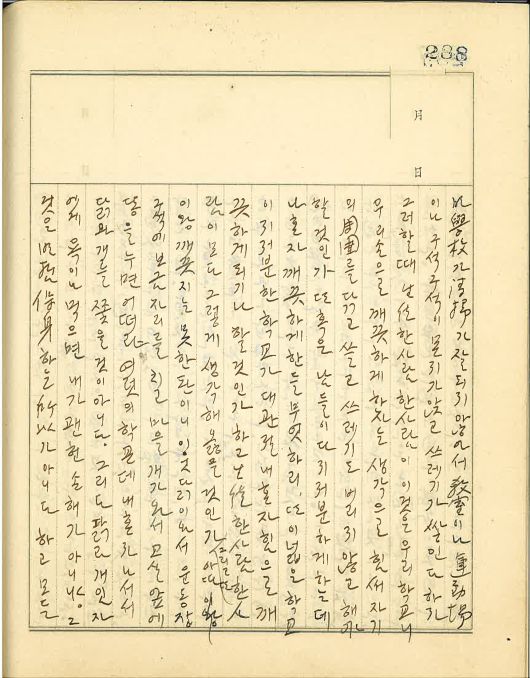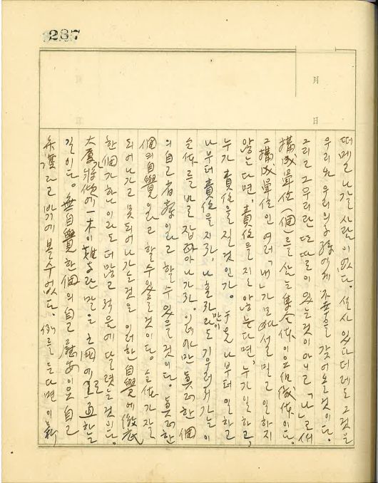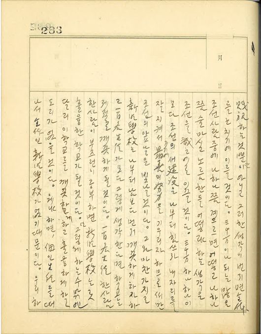 즉 우리들은 스스로 의식지 못하고 사회의 의표(儀表)가 되는 경우가 있다. 너희들은 언제든지 일개 미미한 여생도라고만 생각지 말라. 너희들이 학교에 오가는 길에서나 혹은 집에서 아무렇지도 않게 여기고 하는 거동이 모두 사회의 환시(環視) 속에 있나니 대수롭지 않은 일이 너희들의 일생에서나 또는 이 신명학교에서나 또 혹은 조선 여성에 있어서 지대한 영향을 끼치는 일이 많고 때로는 치명적인 결과를 초래함을 명기하라. 항상 사회적인 책무를 자각해서 자중자애하라. 이것은 전번 조회시간에 말한 전체(全體)와 개(個)의 문제와도 관련되는 일이다.