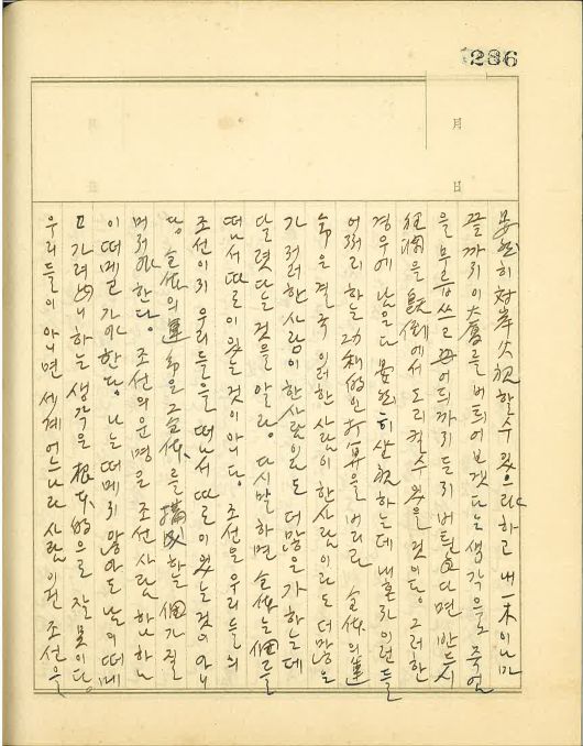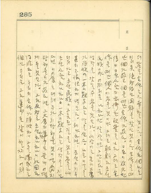 세상에는 흔히 큰 집이 기울어지려 함에 기둥 하나로 버티지 못한다는 말을 쓴다. 나는 이 말을 심히 불유쾌하게 여긴다. 왜냐하면, 조선이 기울어져 가고 조선민족이 그릇된 길을 걷고 있을 때 조선사람 하나하나가 기둥 하나로 버티지 못한다는 생각을 지닌다면 이 큰 집은 대체 누가 지탱해줄 것이며, 지탱해 줄 이가 없다면 그 큰 집의 운명은 끝내 어떻게 될 것인가. 그와 반대로 조선사람 하나하나가 조국과 동포라는 우리의 전체가 기울어지려 하니 그를 구성하는 개인 우리는 그와 운명을 같이 할지라 어찌 안연히 건너편 산의 불 보듯 할 수 있으랴 하고 내 한 기둥이나마 끝까지 이 큰 집을 버티어 보겠다는 생각으로 죽음을 무릅쓰고 어디까지든지 버틴다면 반드시 광란(狂瀾)을 기도(旣倒)에서 돌이킬 수 있을 것이다. 그러한 경우에 남은 다 안연히 좌시하는데 내 혼자 이런들 어쩌리 하는 공리적인 타산을 버리라. 전체의 운명은 결국 이러한 사람이 한 사람이라도 더 많은가 저러한 사람이 한 사람이라도 더 많은가 하는 데 달렸다는 것을 알라.