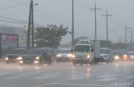 [서귀포=뉴시스] 우장호 기자 = 사진은 기사와 직접적인 관련이 없음. 폭우가 쏟아진 1일 오후 제주 서귀포시 강정동 인근 도로에서 차량들이 낮시간인데도 전조등 환히 밝히고 있다. 2025.05.01./사진=우장호 |