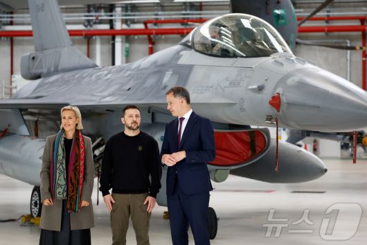 볼로디미르 젤렌스키 우크라이나 대통령(가운데)이 지난 5월 벨기에 브뤼셀 인근 멜스브룩 공군기지를 방문해 알렉산더 드쿠르 총리(오른쪽)와 루디빈 드돈더 국방장관(왼쪽)과 함께 F-16 전투기를 둘러봤다. 2024.05.28. ⓒ 로이터=뉴스1 ⓒ News1 김성식 기자