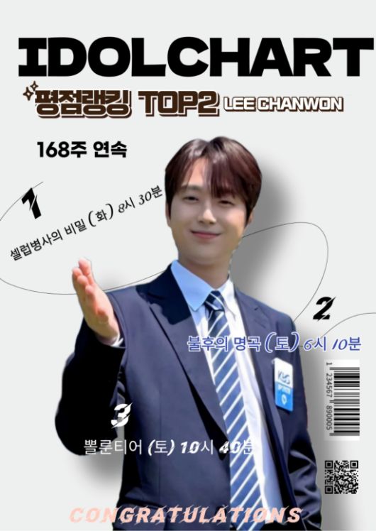 이번 평점 랭킹을 통해 이찬원의 연속 2위 기록은 168주로 늘어났다. 더불어 '좋아요' 역시 9,520개를 획득해 전체 2위에 올랐다.