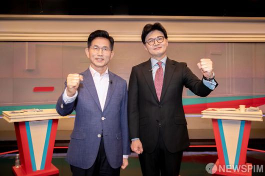 [서울=뉴스핌] 국회사진취재단 = 30일 오후 서울 중구 TV조선에서 국민의힘 제21대 대통령선거 경선 결선투표에 진출한 김문수(왼쪽) 한동훈 후보가 TV토론에 앞서 스튜디오에서 자세를 취하고 있다. 2025.04.30 photo@newspim.com |
