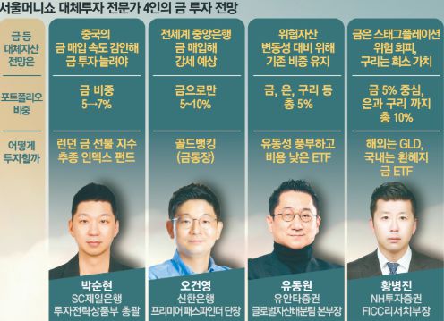 서울머니쇼에서 대체자산과 포트폴리오 전문가 4인방은 오건영 신한은행 프리미어 패스파인더 단장, 유동원 유안타증권 글로벌자산배분팀 본부장, 박순현 SC제일은행 투자전략상품부 총괄, 황병진 NH투자증권 FICC리서치부장이다. 이들은 최근 흔들리는 미국 주식과 채권, 달러 등 전통자산의 구세주로 ‘금’을 꼽았다.