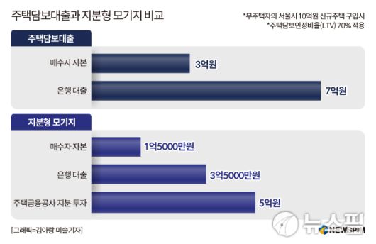 하지만 지분형 모기지 제도를 적용해 주금공이 5억원을 투자한다면 매수자는 나머지 5억원만 마련하면 된다. 5억원에 LTV 70%를 적용할 시 은행 대출 규모도 1억5000만원 가량 줄어든다. 다만 매수자는 주금공이 보유한 지분에 대해 임대료를 내야 한다. 매각 후 시세 차익은 매수자와 주금공이 지분대로 나눈다.