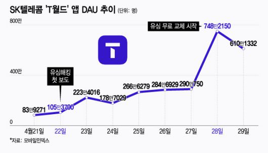 3일 아이지에이웍스 '모바일인덱스'에 따르면 SK텔레콤 T월드 앱은 유심 무료 교체가 시작된 지난달 28일 DAU(일간활성이용자수) 748만명을 기록했다. 직전 주 같은 요일(월요일, 84만명) 대비 791.5% 증가했다. 유심 교체 이틀 차인 29일에도 T월드 DAU는 610만명을 기록하며 여전히 높은 이용자 수를 유지했다.