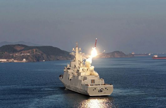(평양 노동신문=뉴스1) = 북한의 신형 구축함 '최현'호가 순항미사일을 발사하는 모습. [국내에서만 사용가능. 재배포 금지. DB 금지. For Use Only in the Republic of Korea. Redistribution Prohibited] rodongphoto@news1.kr |