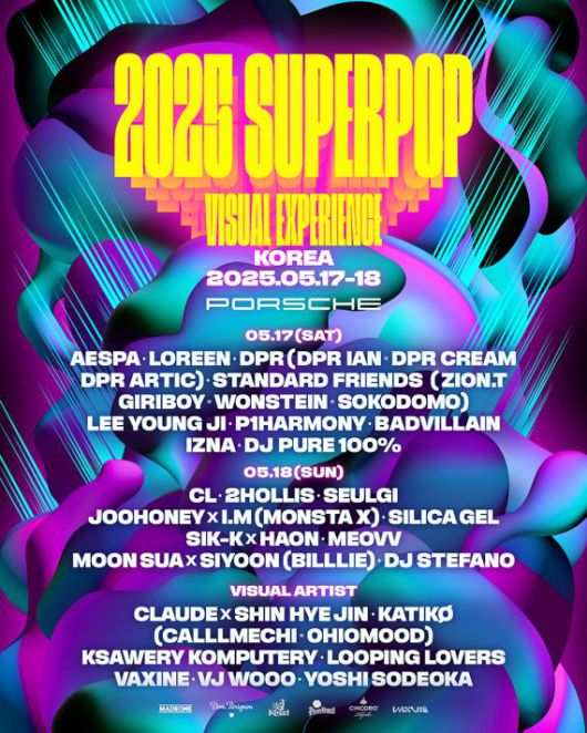 ‘슈퍼팝 2025 코리아’는 오는 5월 17일과 18일 양일간 경기도 고양 킨텍스 제1전시장 1,2홀에서 개최된다. 음악 부문에는 글로벌 K-POP 그룹 에스파(aespa), 퍼포먼스 아티스트 씨엘(CL), 디피알(DPR), 밴드 실리카겔, 래퍼 이영지, 슬기, 아이엠x주헌, 스탠다드프렌즈, 피원하모니, 배드빌런, 이즈나, 미야오, 문수아x시윤, 식케이x하온 등이 이름을 올렸다. 특히 스웨덴 출신 유로비전 우승자 로린(Loreen)과 젊은 감성의 대표주자 2hollis의 국내 첫 내한이 예정돼 글로벌 관객층의 이목도 집중되고 있다.