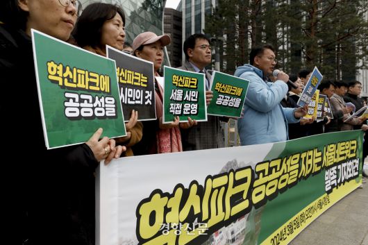 ‘혁신파크 공공성을 지키는 서울네트워크’가 지난해 3월5일 서울 중구 서울시청 앞에서 기자회견을 열고 있다. 문재원 기자 |