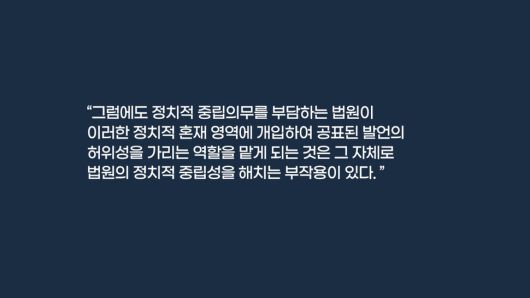 “선거과정은 그 자체가 고도의 정치적 영역에 있다. 선거과정의 공방 속에서 이루어진 다양한 발언은 정치적 이해관계를 바탕으로 사실과 의견 또는 평가가 혼재되어 있어 사실의 허위성을 명확히 가릴 수 없는 것이 많다. 그럼에도 정치적 중립의무를 부담하는 법원이 이러한 정치적 혼재 영역에 개입하여 공표된 발언의 허위성을 가리는 역할을 맡게 되는 것은 그 자체로 법원의 정치적 중립성을 해치는 부작용이 있다. 설령 그 혼재 영역에서 이루어진 사법적 판단이 법적으로 정당하더라도 정치 집단 사이의 이해관계가 첨예하게 대립하는 사안에서는 법원이 선거에 개입하였다는 비판에 놓이게 될 우려가 있다. 정치적 발언에 대한 법원의 법적 평가는 이를 수긍하는 국민들과 그렇지 아니한 국민들 사이에 새로운 갈등과 분란을 촉발할 수 있다.”