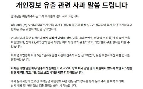 알바몬 개인정보 유출 사과 공지 캡쳐 이미지. |