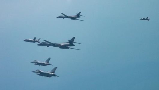 지난달 15일 미 B-1B 전략폭격기를 전개한 가운데 한미 연합공중훈련을 하고 있다.훈련에는 우리 공군의 F-35A, F16 전투기와 미국의 F-16 전투기 등이 참여했다. 뉴시스 |