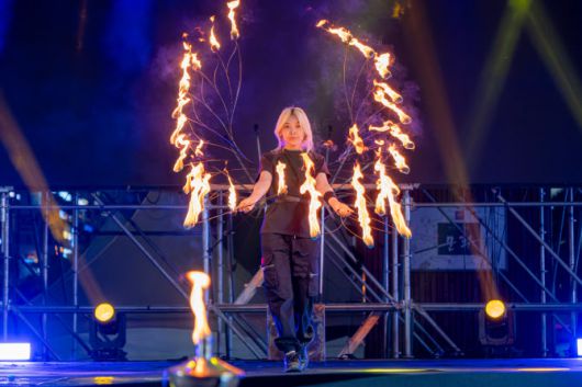 공연팀 ‘예화 플레이밍 파이어’가 2일 안산문화광장에서 개막작인 ‘열정의 조각’ 공연 리허설을 하고 있다. (사진 = 안산문화재단 제공) |