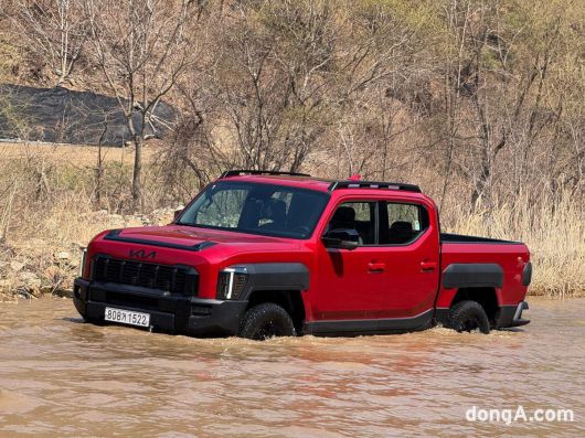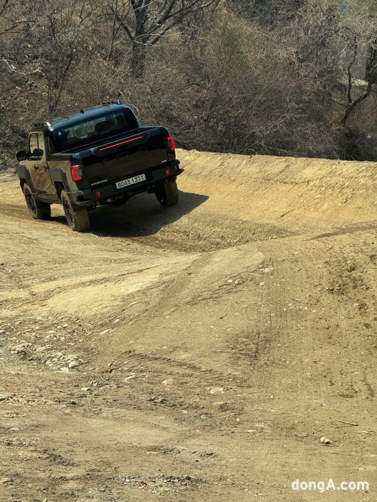 이어진 범피 구간에서는 타스만의 서스펜션 강성과 차체 구조 강도가 고스란히 드러났다. 지면이 울퉁불퉁하게 솟은 코스를 주행하며 차량은 상하로 크게 출렁였지만, 차체는 일관된 균형감을 유지했다. 타스만은 바퀴가 공중에 있을 때조차 미끄러지지 않고, 바닥에 닿는 즉시 부드럽게 접지력을 회복하며 주행을 이어갔다. 기아는 이러한 주행 안정성을 위해 강화 프레임 구조와 함께 멀티링크 서스펜션 시스템, 전자식 LSD(차동기어 제한장치) 등을 조합해 험로 주행에 최적화된 세팅을 적용했다.
