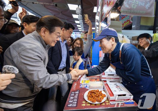 (속초=뉴스1) 이재명 기자 = '골목골목 경청투어 : 동해안벨트편'에 나선 이재명 더불어민주당 대통령 후보가 3일 오전 강원 속초시 중앙로 속초관광수산시장에 위치한 닭강정집에서 상인과 인사하고 있다. 2025.5.3/뉴스12expulsion@news1.krCopyright ⓒ 뉴스1. All rights reserved. 무단 전재 및 재배포, AI학습 이용 금지.