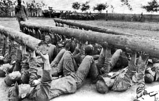 삼청교육대 입소자들이 목봉체조 훈련을 받고 있다. 한국일보 자료사진