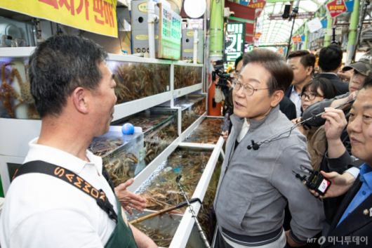 (속초=뉴스1) 이재명 기자 = '골목골목 경청투어 : 동해안벨트편'에 나선 이재명 더불어민주당 대통령 후보가 3일 오전 강원 속초시 중앙로 속초관광수산시장에서 상인과 대화를 하고 있다. 2025.5.3/뉴스1 Copyright (C) 뉴스1. All rights reserved. 무단 전재 및 재배포, AI학습 이용 금지. /사진=(속초=뉴스1) 이재명 기자 |