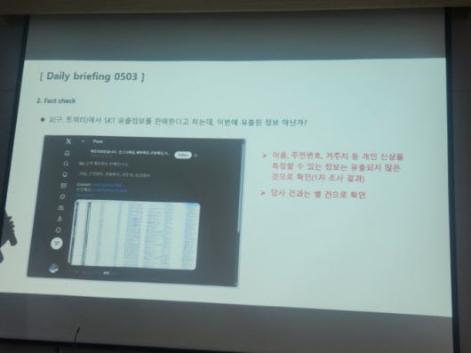3일 SK텔레콤 김희섭 PR센터장은 이번 해킹 사태 관련 일일 브리핑에서 이 같은 사실을 전했다. 김 센터장은 “해당 게시글에는 이름, 주민등록번호, 전화번호, 주소, 유심정보 등 SK텔레콤 가입자 정보를 판매하겠다는 내용이 담겨 있다”면서도 “그러나 SK텔레콤은 과학기술정보통신부의 1차 조사 결과, 이름과 주민번호는 유출되지 않은 것으로 확인됐다”고 밝혔다.