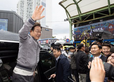 ‘골목골목 경청투어 : 동해안벨트편’에 나선 이재명 더불어민주당 대통령 후보가 3일 오전 강원 속초시 중앙로 속초관광수산시장에서 시민들과 인사를 마친 후 손을 흔들어 인사하고 있다.(사진=뉴스1) |