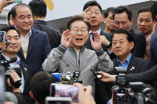 더불어민주당 이재명 대선 후보가 '골목골목 경청투어' 사흘째인 3일 '동해안벨트' 첫 방문지인 강원도 속초시 중앙재래시장에서 도민들을 만나 지지를 호소하고 있다. |