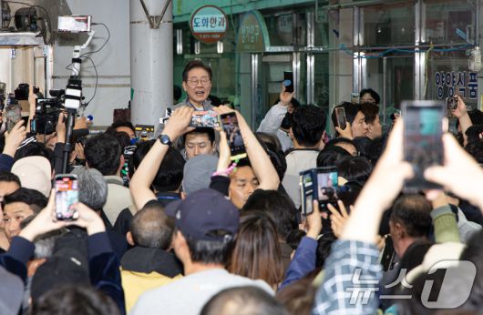 (양양=뉴스1) 이재명 기자 = '골목골목 경청투어 : 동해안벨트편'에 나선 이재명 더불어민주당 대통령 후보가 3일 오전 강원 양양군 양양시장에서 시민들을 향해 연설하고 있다. 2025.5.3/뉴스12expulsion@news1.krCopyright ⓒ 뉴스1. All rights reserved. 무단 전재 및 재배포, AI학습 이용 금지.