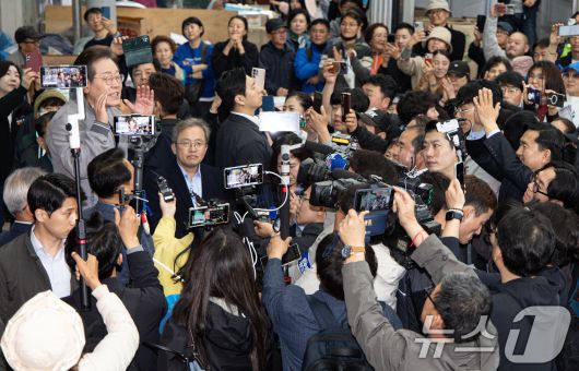 (양양=뉴스1) 이재명 기자 = '골목골목 경청투어 : 동해안벨트편'에 나선 이재명 더불어민주당 대통령 후보가 3일 오전 강원 양양군 양양시장에서 시민들을 향해 연설하고 있다. 2025.5.3/뉴스12expulsion@news1.krCopyright ⓒ 뉴스1. All rights reserved. 무단 전재 및 재배포, AI학습 이용 금지.