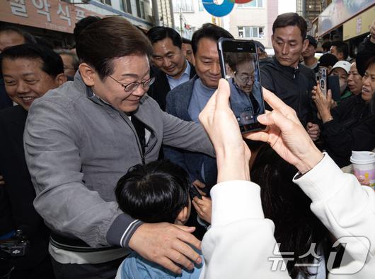 (양양=뉴스1) 이재명 기자 = '골목골목 경청투어 : 동해안벨트편'에 나선 이재명 더불어민주당 대통령 후보가 3일 오전 강원 양양군 양양시장에서 어린이들과 기념촬영을 하고 있다. 2025.5.3/뉴스12expulsion@news1.krCopyright ⓒ 뉴스1. All rights reserved. 무단 전재 및 재배포, AI학습 이용 금지.