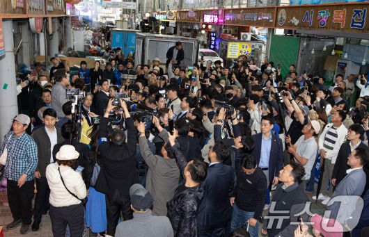 (양양=뉴스1) 이재명 기자 = '골목골목 경청투어 : 동해안벨트편'에 나선 이재명 더불어민주당 대통령 후보가 3일 오전 강원 양양군 양양시장에서 시민들을 향해 연설하고 있다. 2025.5.3/뉴스1