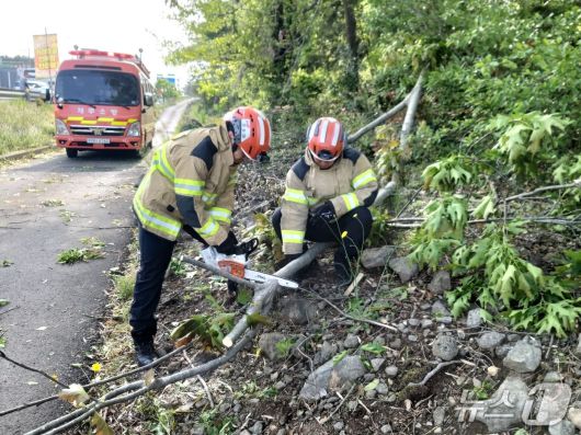 3일 오전 8시34분쯤 제주시 노형동의 한 도로에서 가로수가 강풍에 쓰러져 신고를 받고 출동한 소방대원들이 안전조치를 하고 있다.(제주도소방안전본부 제공, 재판매 및 DB 금지) |