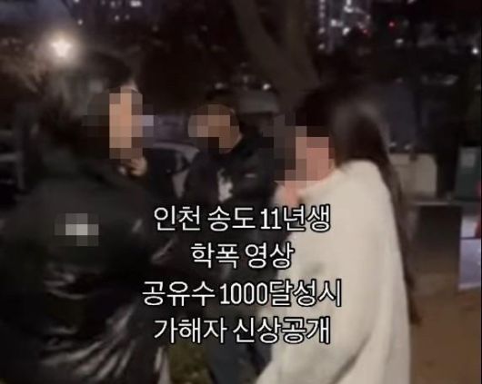 3일 온라인 맘카페 등에 따르면 '인천 송도 11년생 학폭(학교폭력) 영상 공유 수 1000 달성 시 가해자 신상 공개'라는 자막이 떠있는 1분 39초짜리 영상이 전날 SNS인 인스타그램에 올라왔다.