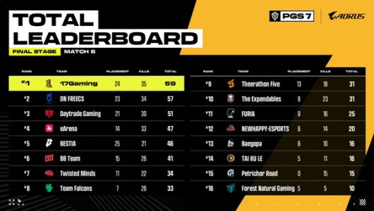 DN 프릭스는 이날 열린 6개 매치에서 치킨 2회 및 순위 포인트 23점, 킬 포인트 34점을 획득하며 토털 포인트 57점을 수확했다. 파이널 스테이지 첫 날 전체 2위에 오르며 우승 가능성을 크게 높였다. 선두인 중국의 17게이밍(59점)과의 점수 차는 불과 2점이다.