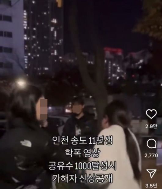 약 1분30초 분량에 영상에는 '인천 송도 11년생 학폭영상. 공유수 1000달성시 가해자 신상공개'라는 자막과 함께 한 학생이 다른 학생을 폭행하는 장면이 담겼다.