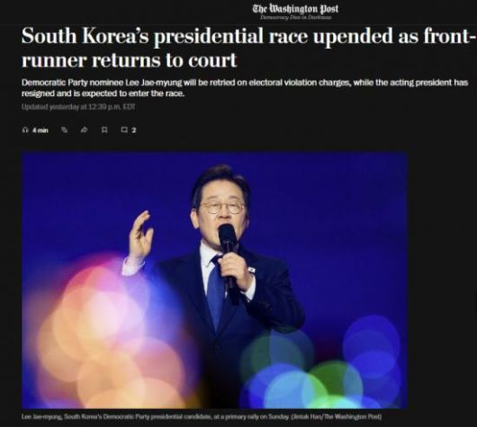 워싱턴포스트(WP)는 "한국 대선판이 선거일을 불과 5주 남기고 완전히 뒤집혔다"며, "대법원은 선두주자인 이 후보에게 다시 재판을 받으라고 했고, 대통령 권한대행은 사퇴했다"고 보도했다. WP는 이번 결정이 '정치적 피로감'을 호소하던 유권자들에게 영향을 줄 수 있다고 전망했다.