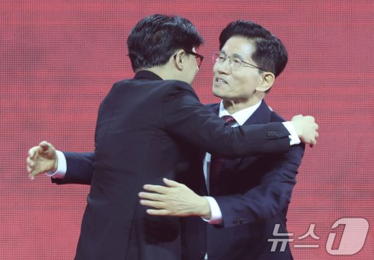 (고양=뉴스1) 이광호 기자 = 국민의힘 김문수(오른쪽), 한동훈 대선 경선 후보가 3일 경기 고양시 킨텍스에서 열린 5차 전당대회에서 당원들에게 인사한 뒤 포옹하고 있다. 2025.5.3/뉴스1skitsch@news1.krCopyright ⓒ 뉴스1. All rights reserved. 무단 전재 및 재배포, AI학습 이용 금지.