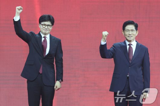 (고양=뉴스1) 이광호 기자 = 국민의힘 김문수(오른쪽), 한동훈 대선 경선 후보가 3일 경기 고양시 킨텍스에서 열린 5차 전당대회에서 당원들에게 인사하고 있다. 2025.5.3/뉴스1skitsch@news1.krCopyright ⓒ 뉴스1. All rights reserved. 무단 전재 및 재배포, AI학습 이용 금지.