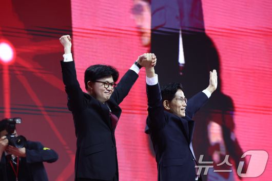 (고양=뉴스1) 김민지 기자 = 한동훈(왼쪽), 김문수 국민의힘 대선 경선 후보가 3일 경기 고양시 킨텍스에서 열린 5차 전당대회에서 손을 맞잡아 들며 인사하고 있다. 2025.5.3/뉴스1kimkim@news1.krCopyright ⓒ 뉴스1. All rights reserved. 무단 전재 및 재배포, AI학습 이용 금지.