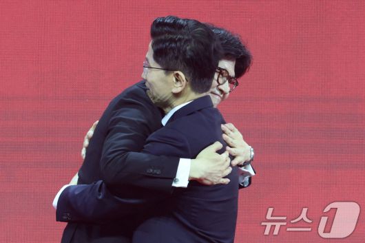 (고양=뉴스1) 이광호 기자 = 김문수(오른쪽), 한동훈 국민의힘 대선 경선 후보가 3일 경기 고양시 킨텍스에서 열린 5차 전당대회에서 당원들에게 인사를 마친뒤 포옹하고 있다. 2025.5.3/뉴스1skitsch@news1.krCopyright ⓒ 뉴스1. All rights reserved. 무단 전재 및 재배포, AI학습 이용 금지.