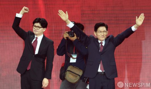 [고양=뉴스핌] 최지환 기자 = 김문수, 한동훈 국민의힘 대선 경선 후보가 3일 오후 경기 고양 킨텍스에서 열린 국민의힘 제5차 전당대회에서 당원들에게 인사하고 있다. 2025.05.03 choipix16@newspim.com