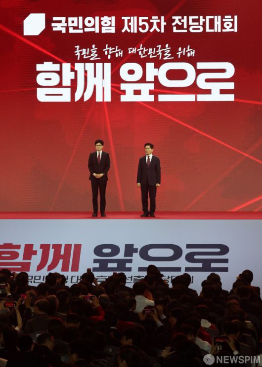 [고양=뉴스핌] 최지환 기자 = 김문수, 한동훈 국민의힘 경선 후보가 3일 오후 경기 고양 킨텍스에서 열린 국민의힘 제5차 전당대회에서 자리해 있다. 2025.05.03 choipix16@newspim.com |