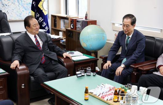 (서울=뉴스1) 오대일 기자 = 한덕수 무소속 대선 예비후보가 3일 오후 서울 영등포구 헌정회에서 정대철 헌정회장을 예방하며 대화를 나누고 있다. 2025.5.3/뉴스1